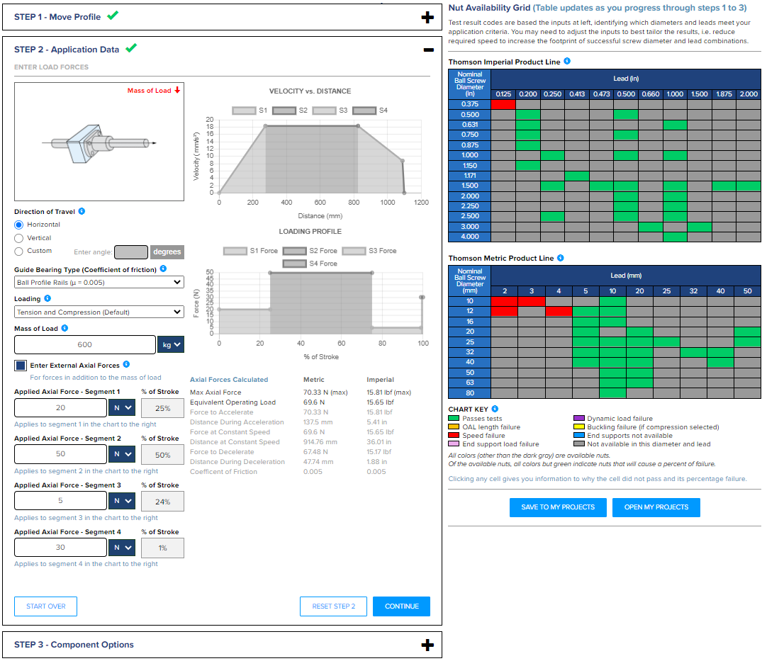 Design engineers working from potentially complex motion profiles with narrow tolerances can benefit from this new tool’s guidance in getting to the just-right ball screw assembly for their specific application design requirements. Immediate feedback reveals a dynamic pool of relevant design options as application parameters are entered via an intuitive, visual interface. Dynamic feedback allows design engineers to understand potential trade-offs and quickly iterate toward an optimal design solution. Time is a key benefit to using the new tool as it requires only minutes to complete detailed performance calculations and product selections that could otherwise take hours to accomplish manually.
